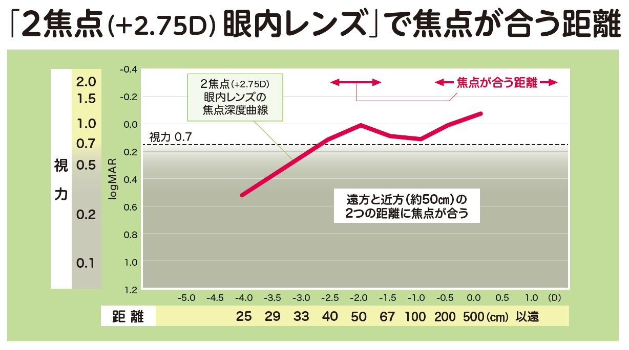 遠方と近方(約50㎝)の2つの距離に焦点(ピント)が合う多焦点眼内レンズ