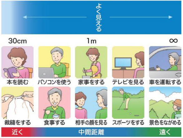 - 遠方(5m以遠)・中間(60cm)・近方(40cm)3点での優れた見え方を提供し、眼鏡使用頻度の大幅減少を可能に