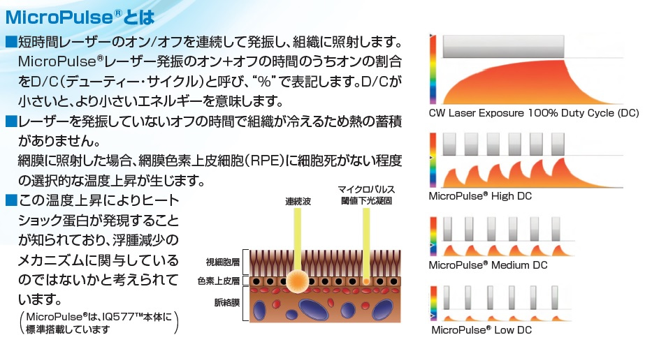 簡単にいいますと目に優しい非常に侵襲の少ないレーザー治療となります。 非常に短い凝固時間のレーザーを連続発振し照射することで選択的に網膜色素上皮に熱のエネルギーが伝わるという性質を応用して開発されたレーザー治療です。 従来の光凝固では網膜に凝固斑が残り、その後凝固斑の拡大により視野障害、視力低下をきたすことがあります。 しかし、マイクロパルス閾値下凝固によるレーザーの場合、それが見られず非常に侵襲の少ない治療となります。 ただ全てのレーザーをこの治療で補える訳ではありませんのでご相談いただければと思います。